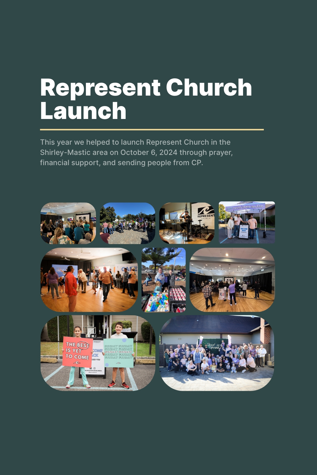 This year we helped to launch Represent Church in the Shirley-Mastic area on October 6, 2024 through prayer, financial support, and sending people from CP.