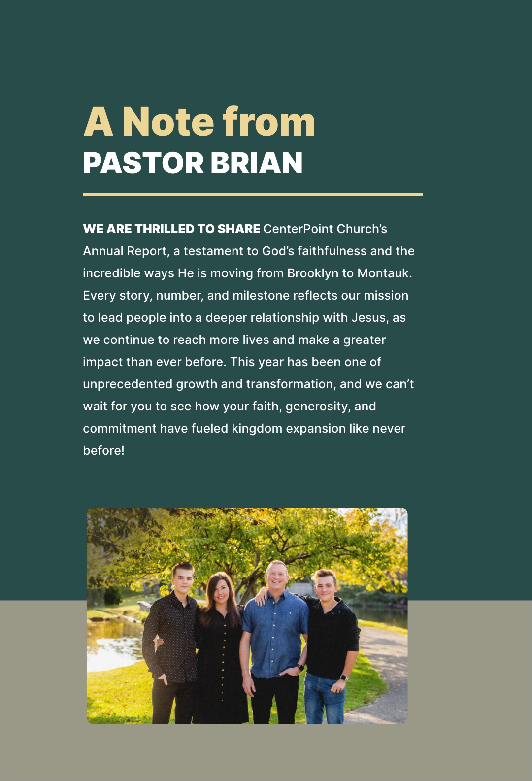 WE ARE THRILLED TO SHARE CenterPoint Church’s Annual Report, a testament to God’s faithfulness and the incredible ways He is moving from Brooklyn to Montauk. Every story, number, and milestone reflects our mission to lead people into a deeper relationship with Jesus, as we continue to reach more lives and make a greater impact than ever before. This year has been one of unprecedented growth and transformation, and we can’t wait for you to see how your faith, generosity, and commitment have fueled kingdom expansion like never before!