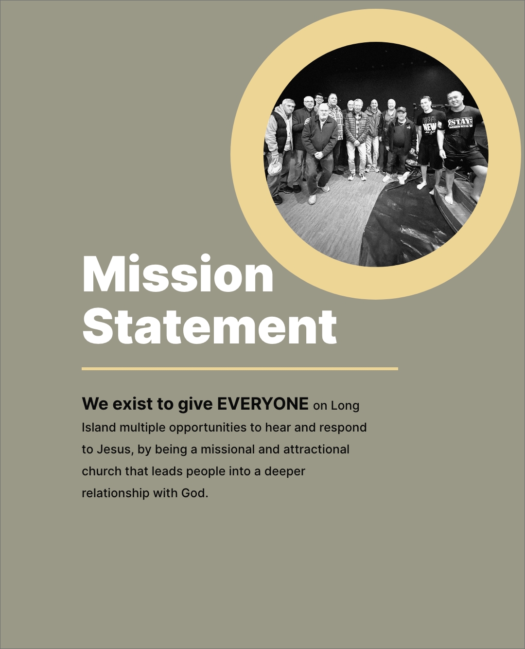 We exist to give EVERYONE on Long Island multiple opportunities to hear and respond to Jesus, by being a missional and attractional church that leads people into a deeper relationship with God.
