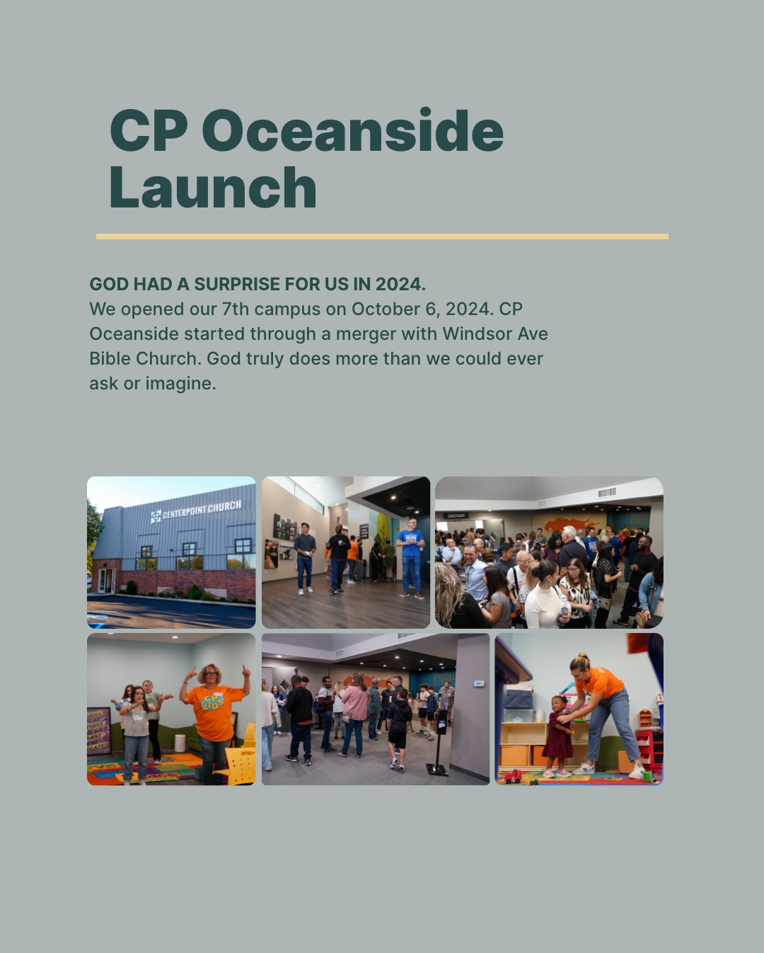We opened our 7th campus on October 6, 2024. CP Oceanside started through a merger with Windsor Ave Bible Church. God truly does more than we could ever ask or imagine.